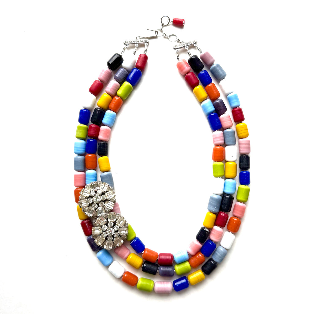 A jubilant celebration of happy times, joyful, vibrant hues join with vintage sparkle for a sincerely smile-inducing gem. The cylindrical beads are each made entirely by hand in Indonesia, and they alternate with faceted silver beads from India for a three-strand drape of delight that creates a buoyant backdrop for a pair of vintage rhinestone earrings. We knew these sparkling statement earrings from the 50s or 60s would make wonderful additions at the side of some strands when we discovered them at a North Carolina antique haunt last spring. Completing the colorful look at back is a vintage rhinestone clasp that allows adjustable lengths from 18 to 20" overall.