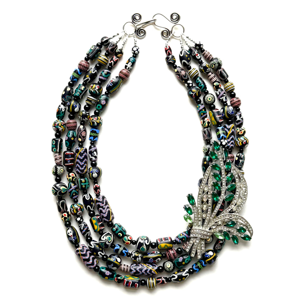 A gal with her own style and sense of direction is a wonder to behold, and we're hoping this gem is right up her alley. What a treat to stumble upon these beautiful beads, made by hand in Indonesia in the style of glasswork from Venice whose tradition in the craft has been celebrated since the 8th century. Each bead of the four strands is entirely unique, featuring delightful patterns and designs - almost like an elevated style of graffiti - in white, green, red, blue, and yellow against a black ground. Stunning at the side of the strands is a vintage bouquet (perhaps from the 1940s) made of rhinestones in gorgeous green and white and measuring over 4" length like the most marvelous, statement-making corsage. A sterling silver over copper hook clasps the necklace at back, measuring 21" in overall length. Combining rare finds and path-paving style, she's got a way of making her mark.