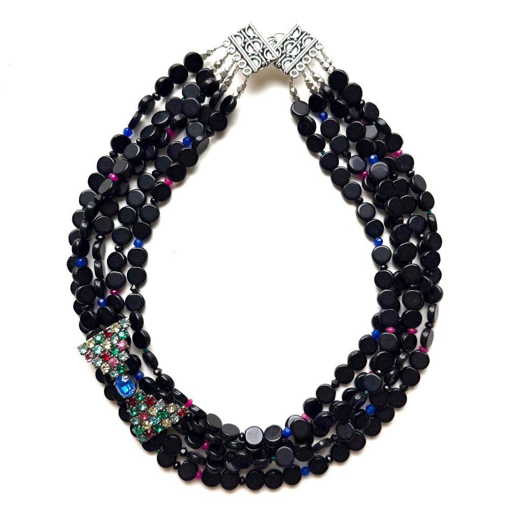 No gift like the present, and this gem is here to remind us all at how lovely and colorful right now can be. A vintage jeweled bow (from the late 1940s or early 1950s) is bright and hopeful in hues of brilliant blue, pink, green, red and pale yellow. Set against a beaded backdrop of handmade glass coin beads in midnight black, the bow brooch becomes a standout, and the addition of tiny beads of pink quartz, emerald crystal, black crystal, and blue quartz throughout the five strands only heightens the reference to vibrant and vital moments here and there (and the charming colors of the brooch.) A silver-over-copper clasp hooks at back, and the necklace measures 18" length, shortest strand.