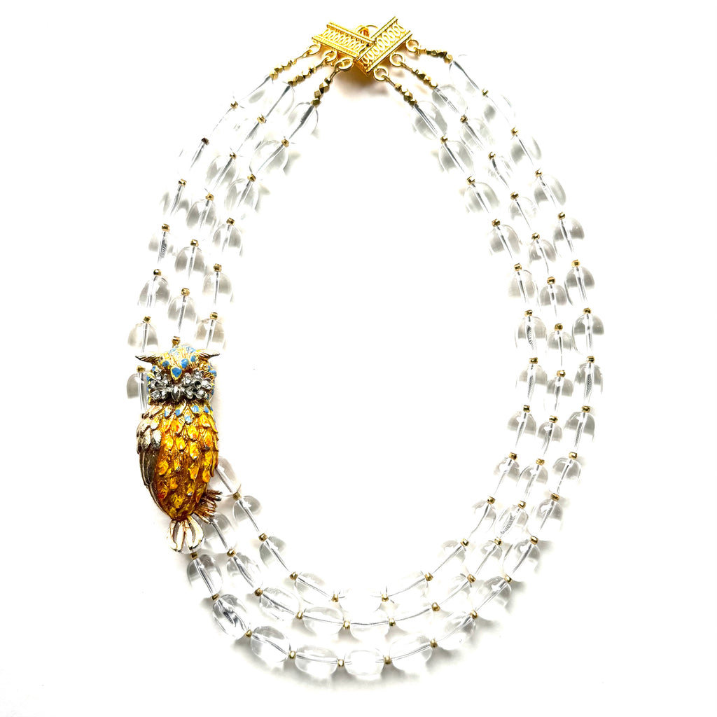 Your wisdom and clarity just might be your greatest gifts, and we channeled your sage spirit in a design that speaks to these strengths. Three strands of polished rock crystal are lovely, alternating with small golden brass beads throughout to set the stage for a vintage enamel and rhinestone owl brooch at the side, as if perched on a tree branch. The beautiful bird shows such wonderful texture in its feathers and in the jewels around its eyes, exuding charm and character. (Two more gifts you possess, no doubt!) A 14 karat gold over copper clasp hooks at back, necklace measuring 18" length at its shortest strand. Owl measures 2.5" length.