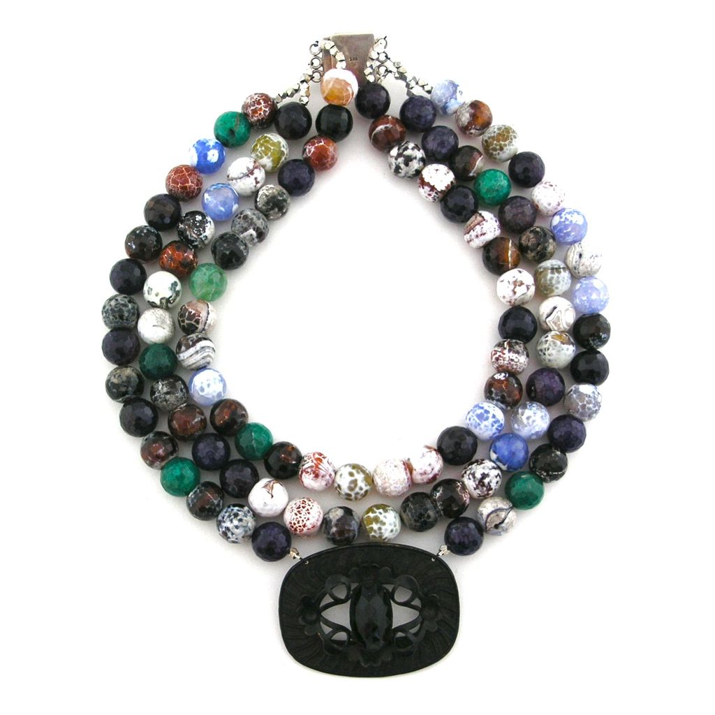 The ultimate irony of rush hour – there doesn't seem to be much rushing, rather more waiting. Also ironic: our black jeweled sash pin sitting happily at front and center of the design is actually an early 20th century mourning brooch, worn by Victorian women in strict pursuance of dress codes following the death of a loved one. Encircling the meaningful and beautiful centerpiece are three strands of faceted fire agate beads, their vibrant, crackled pattern and color bringing life and action to a wonderfully wearable design. A black jeweled clasp from India sits at back, approximately 19” long overall.