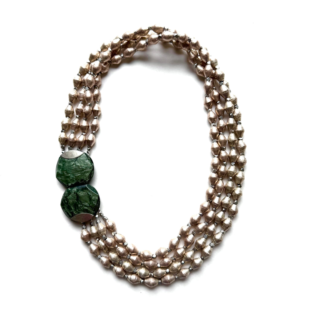 A reminder that there is always a silver lining, we combined hand-crafted beads of hollow silver from Africa with faceted silvered brass beads from India for a substantial style that may be clasped at the side or at back by an Art Deco buckle. Itself with a silver lining (literally) the 1930s design is made of pearly green celluloid and brings the quartet of strands together in such a hopeful and beautiful way. Necklace measures 18" length.