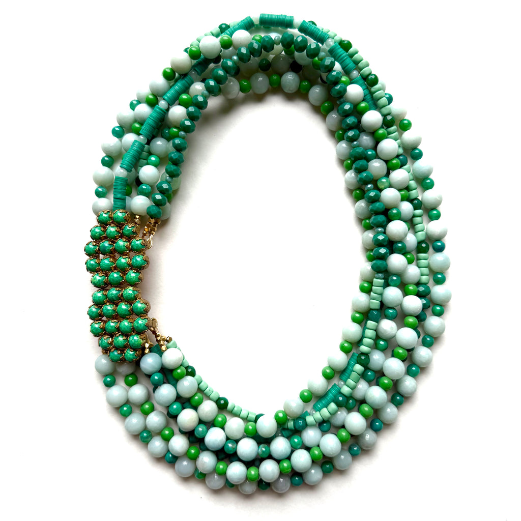 An encouragement of greener pastures ahead, seven vibrant and playful strands bring together beads of amazonite, vinyl, glass, crystal, turquoise, agate, and chalcedony for a gorgeous green collection, clasped by a vintage green beaded buckle from the 1940s or 50s. Wearable two ways - with the buckle at the side of the strands or at the back of the neck - this is a statement style that soothes with its hues and inspires with its variety and drape of beads. Necklace measures 18" length, shortest strand.
