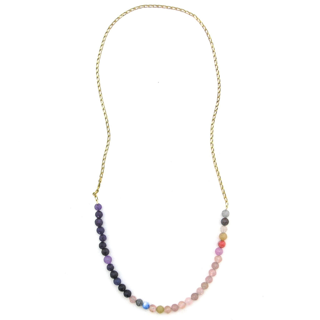 Simplicity becomes you, and a design as straightforward-yet-stylish as this may lead you to the gal you've always wanted to become. A single strand of faceted gemstone beads (comprising rose quartz, jade, and amethyst, among others) combines with a vintage brass chain for a throw-on-and-go look measuring 27.5" in length.