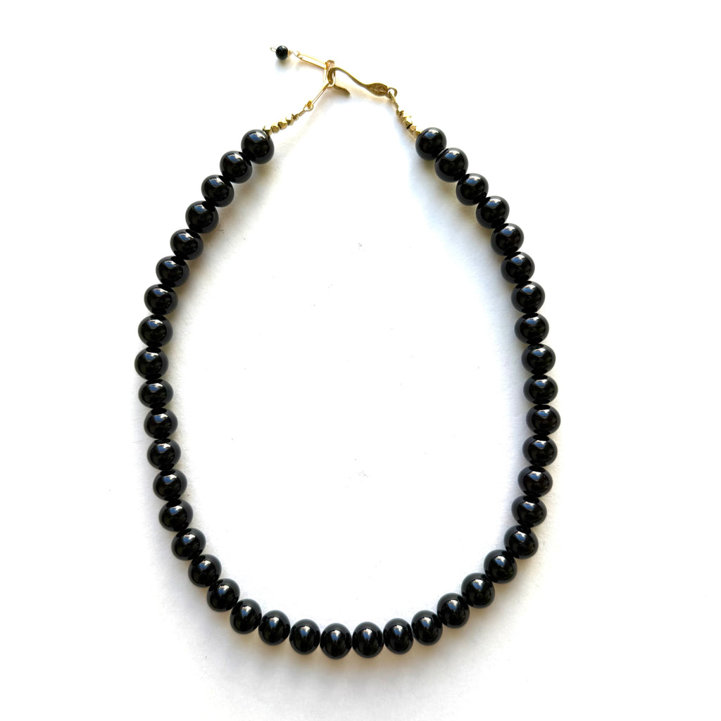 These "dead stock" vintage beads have been a staple of Elva Fields designs since our early days, and we loved the idea of creating a simple strand of them for you to enjoy. With the addition of a vintage brass hook (by another famous costume jewelry firm, Napier) and gold-over-brass chain, the single-strand necklace - here in black glass beads of just around 0.25" diameter - becomes adjustable from 17 to 18" length overall. It's our hope that these Birthday Beads remind you to celebrate every day with effortless style that is sure to be a timeless classic.