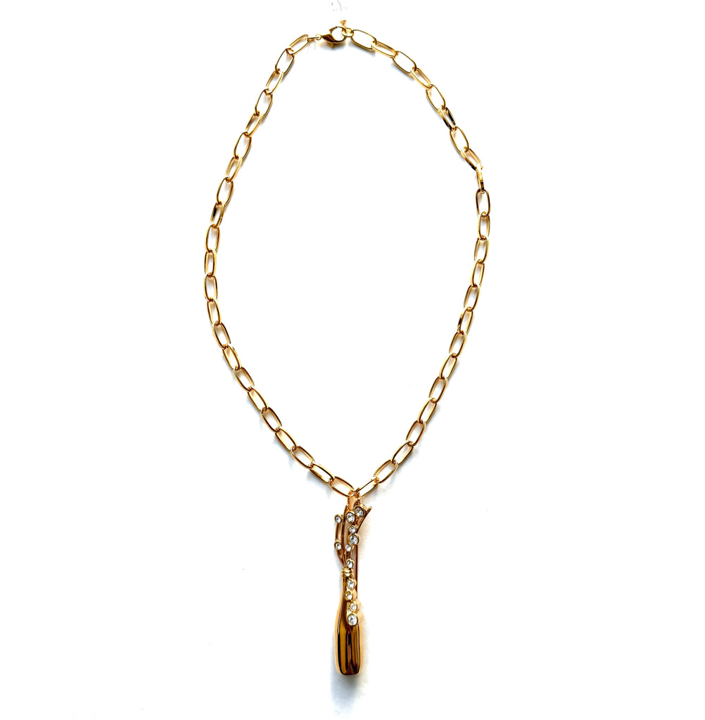 With a spray glittered with small sparkling rhinestones, this vintage bottle brooch is forever celebrating. Whether worn at the end of this beautiful 18 karat gold over brass chain (pinned to a link) or perhaps adorning a favorite dress or jacket for a celebratory occasion, the brooch always brings a festive feeling along. Since the bottle brooch is detachable, the chain may also be worn on its own for a timelessly classic look, adjustable up to 22" length.