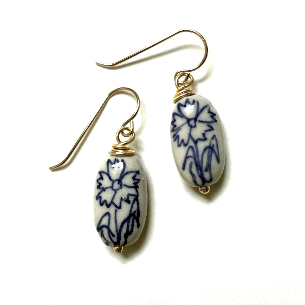 A vintage hand-painted ceramic bead shows a simple flower outline in beautiful blue. Suspended from 14 karat gold filled wires, these are our version of minimalist folk chic. Each measures just over 1" length.
