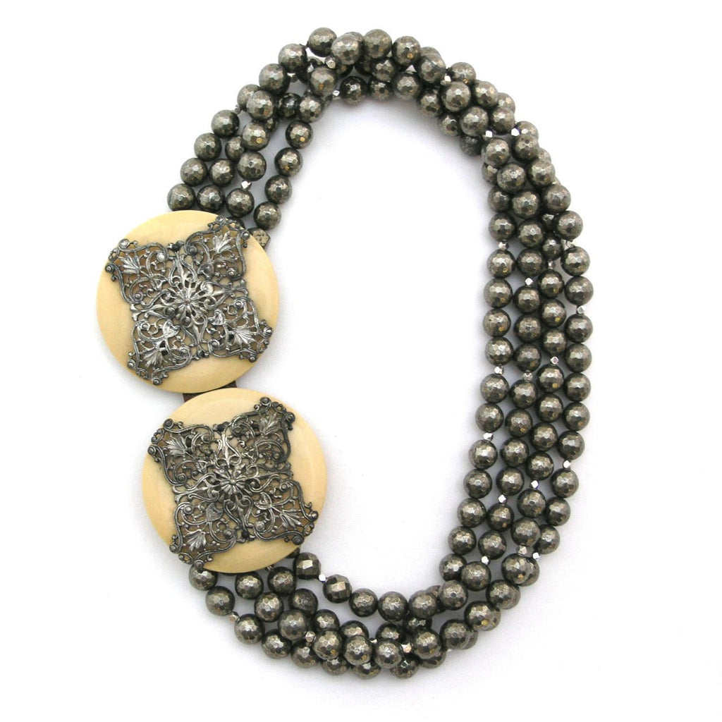 We're fools for filigree. Well, and fool's gold, actually. Together, it's a pretty unbeatable combination, and we're smitten with this style. A quartet of faceted pyrite bead strands (with some faceted silvered brass beads throughout for good measure) is brought together by a 1930s celluloid and silver metal filigree buckle that becomes the design's clasp. Choose to wear the oversized stunner at the side to show it off or around back to allow the pyrite drape to delight--either way, it's a new neutral you'll wear again and again. Measures 19" in length.