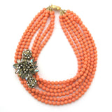 One thing is for certain, you'll fall head over heels for this gem. Strands of faceted coral resin are a beautiful backdrop for a vintage rhinestone jeweled brooch-and-earrings set we found this fall. From the wired "stamens" mid-blossom to the captivating shimmer of the topaz- and pale lemon-hued stones, we were instantly smitten. Add blushing pink? Toast. With gilt copper clasp at back, the design measures 18" in length.