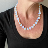 Luminescent opal glass with flashes of pinks, blues, and greens in the shape of happy hearts line a single strand along with tiny faceted brass beads for a bit of golden sparkle. This lovely, layerable necklace measures from 17.5" to 20.5" with its lobster claw and chain clasp.