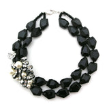 Realizing the importance of a first impression, you take extra care to present your best appearance at all times. Although you already possess a well manicured wardrobe of essentials, it never hurts to have that little 'something extra' to make that first impression a memorable one. A classic pairing of costume pearls and rhinestones adorn a vintage japanned (black metal)setting brooch by Regency. Two strands of faceted black glass nuggets provide a unique yet neutral backdrop, making this a truly go-with-anything style. A sterling silver leaf hook provides closure at the back of this 17.5" look that will fit right in with your impeccable style.