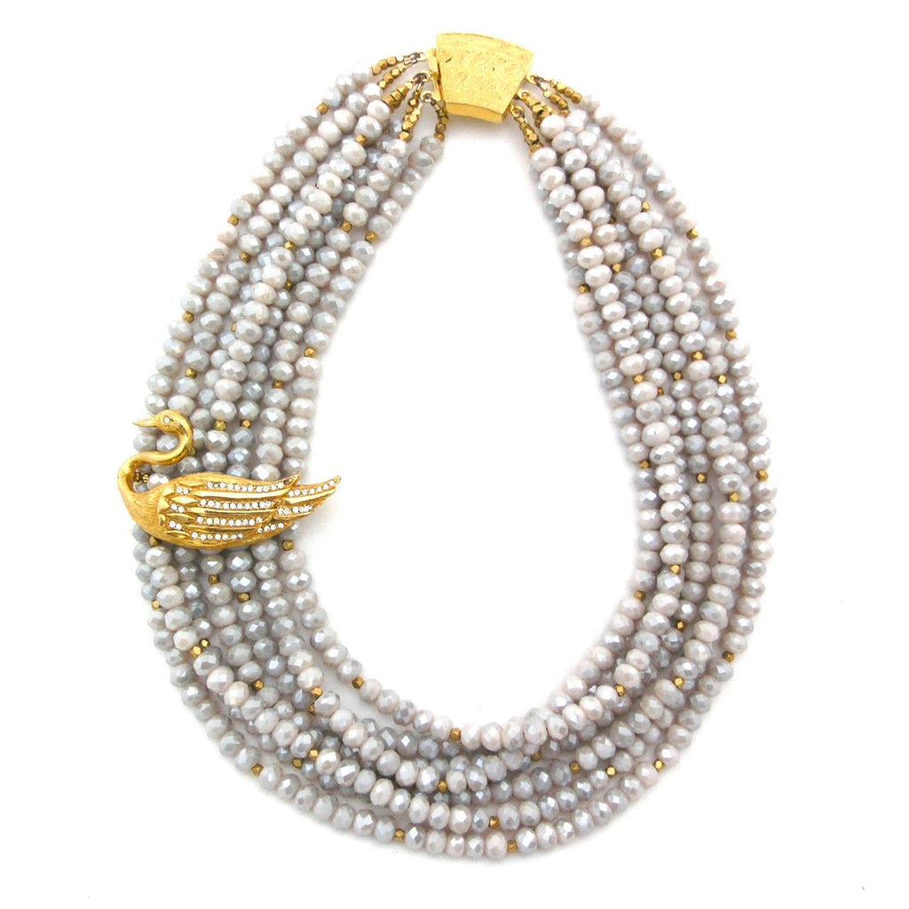 We know you--the classic gal, sophisticated and always up-to-date on the latest trends. No wonder you've already got an eye on this beauty--what a show-stopper! With seven strands of faceted, iridescent, champagne crystal, you'll be the life of every party. And did we mention the detachable, gold tone and rhinestone studded swan brooch by Oleg Castini... Need we say more? Measuring 18" in length, the look is completed with a gilt copper box clasp at back.