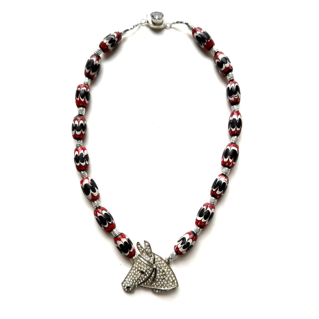 Never has there been a more Louisville look - and it was purely by happenstance! We discovered this likely-1930s enamel and rhinestone horse head brooch at a favorite flea market over the summer, knowing it would be cherished by one of our many equestrian-style-loving ladies here in the Bluegrass and beyond. Taking a cue from its black enamel bridle and red rhinestone eye, we spotted these handmade African glass beads and thought they'd make a nice accompaniment. When the design was complete, we realized we combined team colors from the University of Louisville (shout out to all the Cards fans in town!) AND a nod to Derby with the subtly shimmering horse at front center. The only thing more Louisville would be to dip this necklace in bourbon. (But how 'bout we just toast the necklace with it?) Clasped with a glass and silvered copper beauty at back, the necklace measures 18" length.